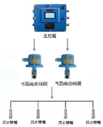 當(dāng)傳感器探測(cè)到控制信號(hào)時(shí),信號(hào)送入主控箱,主控箱先后控制高壓風(fēng)閥、高壓水閥開啟,將高壓風(fēng)、高壓水輸送到風(fēng)水噴頭(即氣水噴頭)進(jìn)行噴霧降塵(風(fēng)水噴頭可對(duì)風(fēng)水壓力大小進(jìn)行調(diào)整),噴霧工作至延時(shí)時(shí)間(延時(shí)可調(diào))停止噴霧降塵;當(dāng)信號(hào)再次觸發(fā)時(shí),進(jìn)行下一個(gè)工作循環(huán)過程。